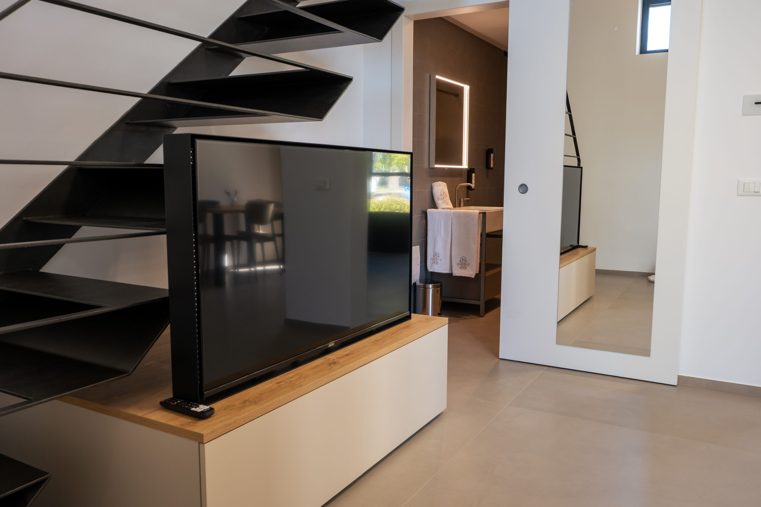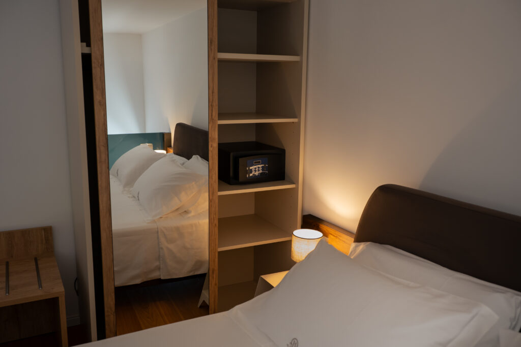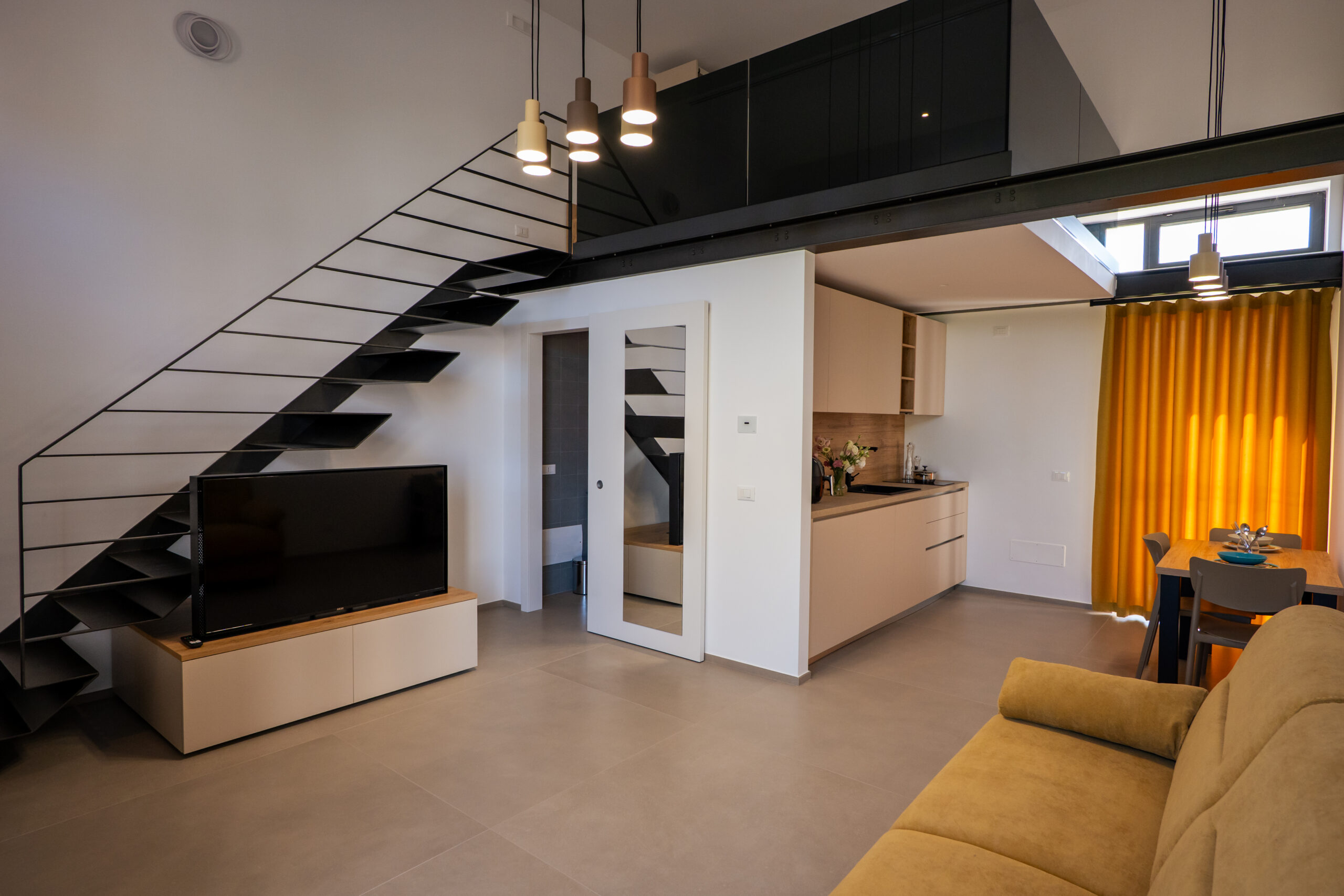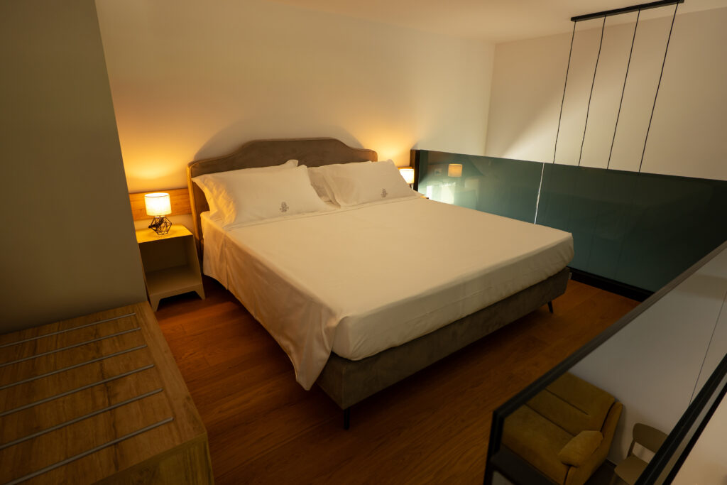Sul soppalco si trova la zona notte con letto matrimoniale king size e armadio guardaroba con cassaforte.